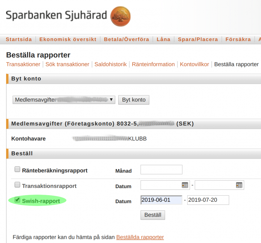 Sedan kan ni logga in i er vanliga internetbank och hämta ut en Swish-rapport. Rapporten kan dock vara svår att hitta internetbanken. Här är ett exempel på hur det ser ut i Swedbank där man går in på kontot som Swish-numret är kopplat till och klickar sig vidare till ”Beställa rapporter”.
